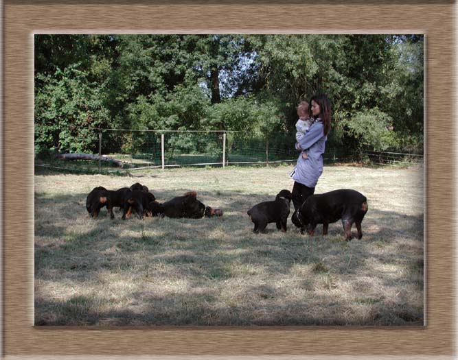 en train de mordiller les pattes de leur grand-père Gurun qui se roule dans l'herbe sous l'oeil d'Alizée , de sa mère et de